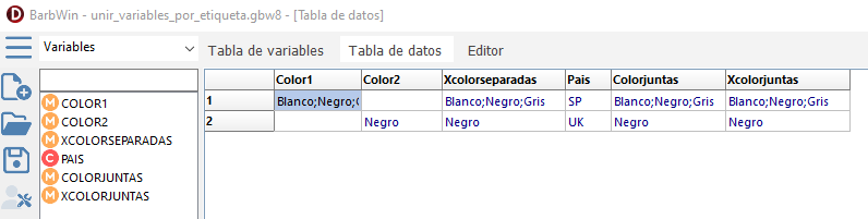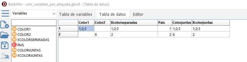 También puede hacerse estando juntos los colores en una única variable. La variable original de registro es COLORJUNTAS