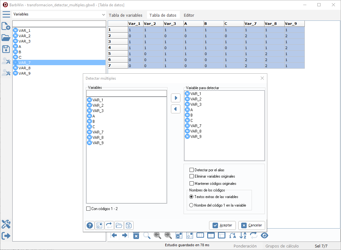 Las variables que cumplen el criterio establecido, se muestran para validar en un diálogo final, sonde el usuario tiene opción de indicar que no se genere la múltiple de alguna detección errónea. El resultado final sería la creación de una variable múltiple por cada columna de detección.El nombre de la vraiable está en cabecera de la columna.