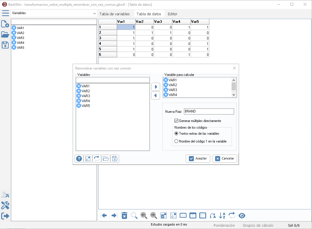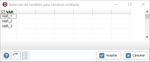 Utilidad que permite agilizar el proceso de creación de múltiples en BarbWin, fundamentalmente de bancos de datos importados como externos. Supongamos que un usuario de SPSS nos manda un banco de datos, con un dicionario de datos donde nos indica que desde var1 hasta var5, los datos conforman una variable de tipo múltiple. Como la forma en la que está estructurado el nombre de las variables no permite la detección automática de múltiples vista en este mismo capítulo, esta funcionalidad nos permite ser más eficientes.