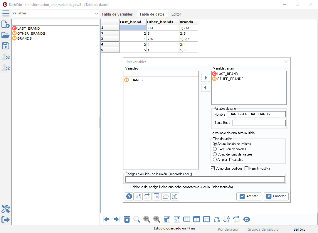 - Comprobar códigos, que permite realizar una comprobación de si utilizando la opción de acumular, todos los códigos son iguales en todas las variables a unir.