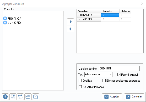 La orden agregar variables permite unir variables de forma que el valor resultante tenga un formato fijo. Imaginemos por ejemplo que tenemos por separado el indicativo de provincia y el código de municipio por separado y queremos unirlo para forma la variable código postal. Necesitamos utilizar la orden agregar variable para: