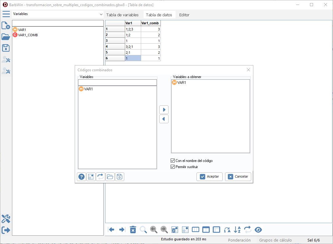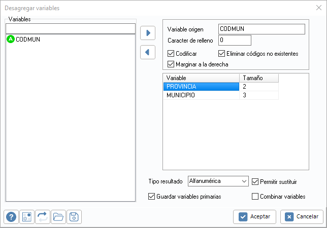 - Guardar variable primaria; Combinar variables, funcionan de manera conjunta. Si se activa esta segunda opción, se permite que las variables desagregadas puedan ser combinadas nuevamente en otra variable, pudiendo si se activa la opción “guardar variables primarias” mantener las variables desagregadas.