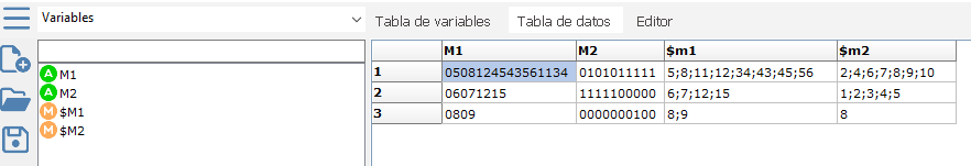 Dada una/s variables de tipo alfanumérico, creará una/s variables de tipo múltiple dividiendo la variable alfanumérica según el valor de dígitos que se le indique. Imaginemos la cadena almacenada en una variable de tipo alfanumérica “0508124543561134”. Aplicada esta funcionalidad, se obtendrá con valor igual a 2, la siguiente información múltiple 5;8;12;45;43;56;11;34.