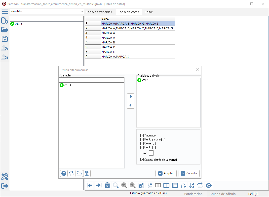 Esta funcionalidad permite dividir el contenido estructurado de una alfanumérica en otras variables. La variable original se divide en tantas variables como sea necesario. El número de variables dependerá del número de separadores máximo en el contenido de un registro. En estas imagenes, se muestra un ejemplo de entrada de datos, diálogo y resultado.