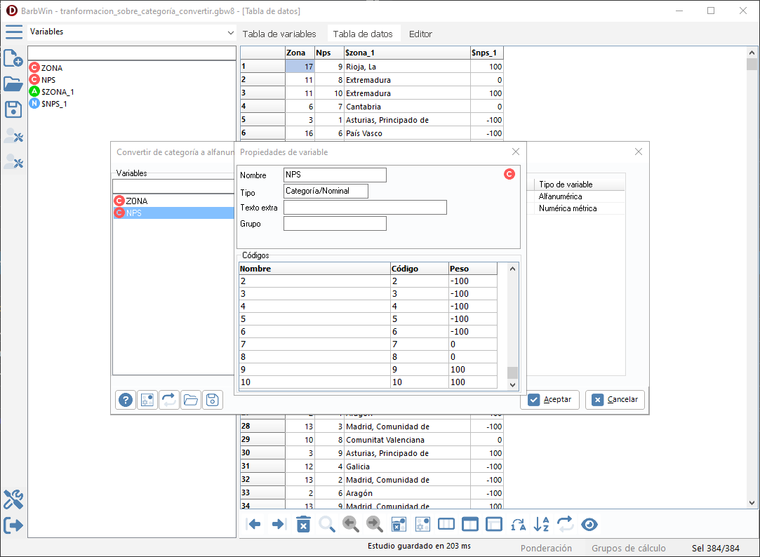 Convierte una variable de categoría en alfanumérica (utilizando el nombre del código o texto de la etiqueta) o en numérica (utilizando el peso).