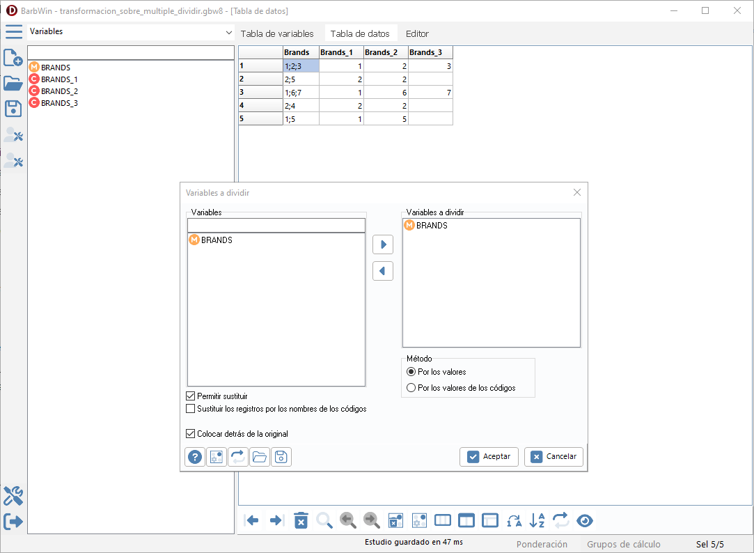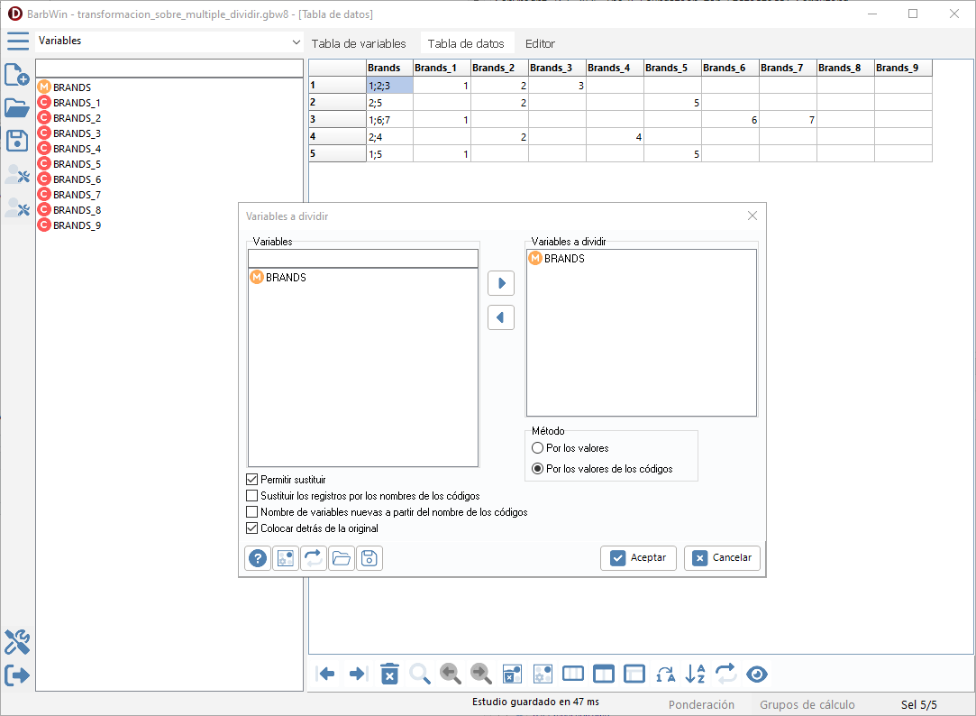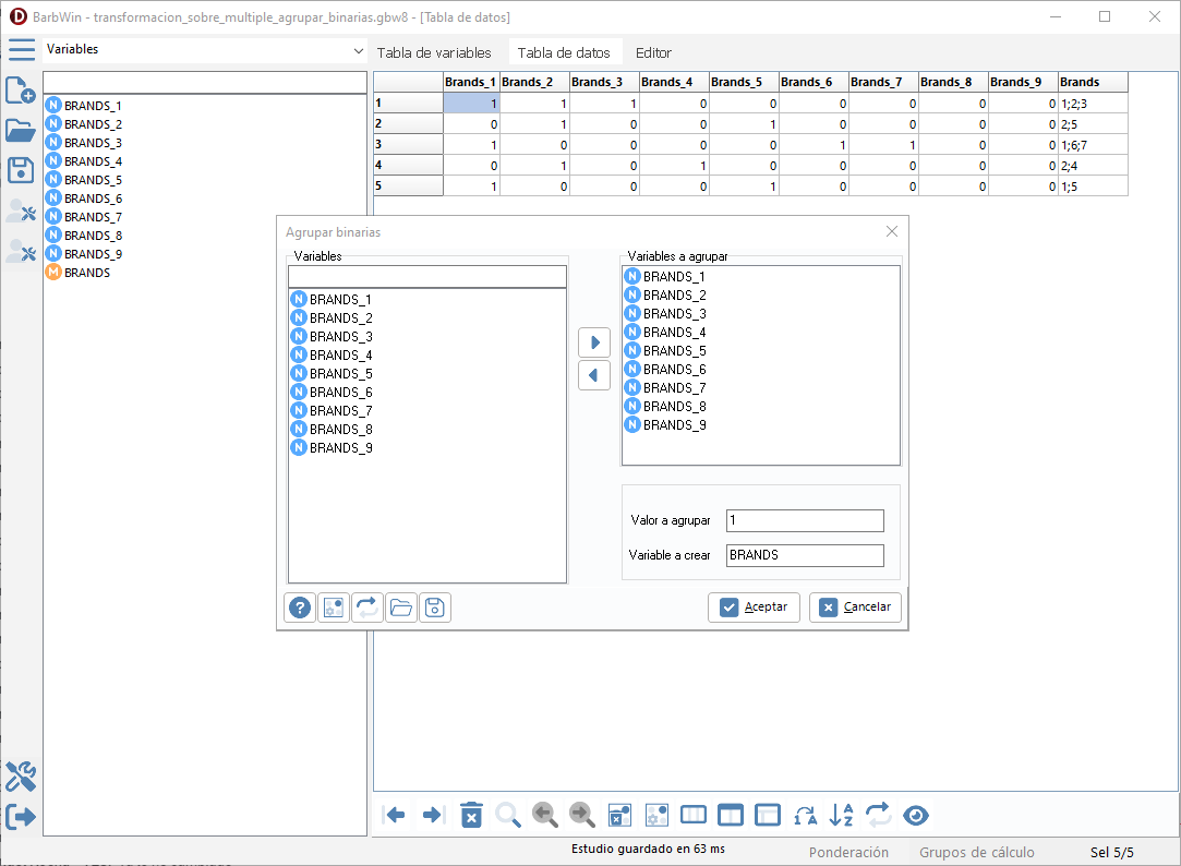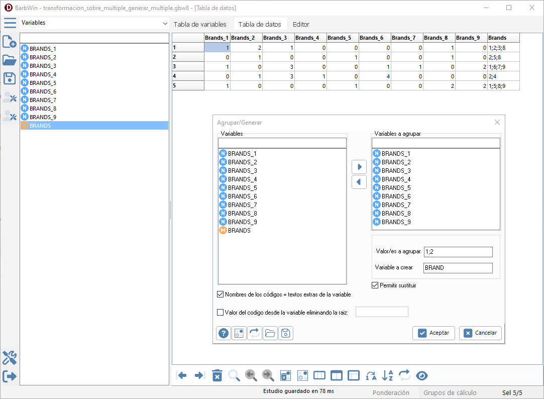 Por ejemplo, consideremos que el archivo transformacion_sobre_multiple_generar_multiple.gbw8 tiene 9 variables (una por maca) donde se ha dado una valoración a unos patrones con valores de 0 a 5. Por motivo de investigación, nos interesa recoger aquellas marcas que tienen valor 1 o 2. Este sería el proceso y el resultado.