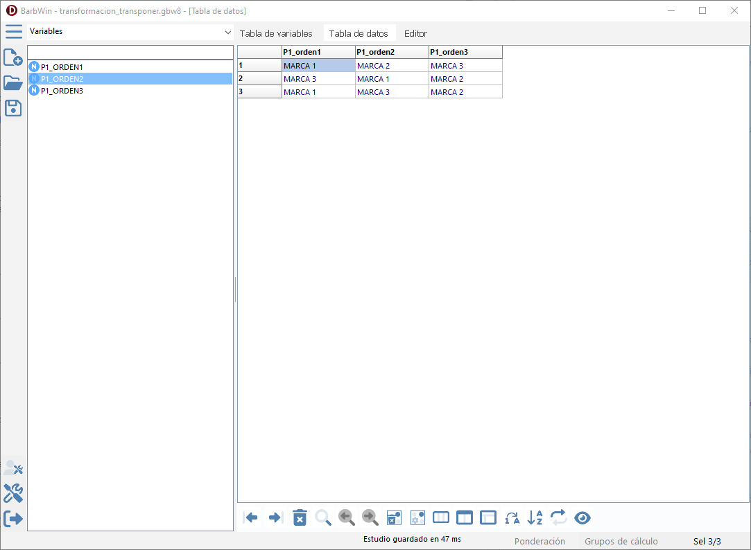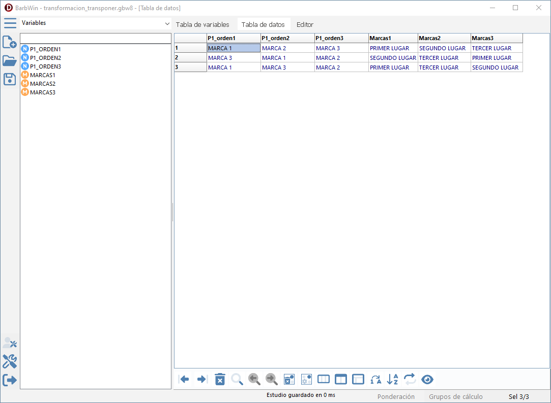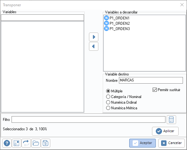 Transponer crea nuevas variables, una por cada código de las variables originales a transponer que deben poseer la misma codificación. El caso más típico suele ser el de un ranking de tres marcas, donde la primera variable, indica el código de la marca elegida en primer lugar; la segunda variable, indica el código de la segunda marca elegida y en extensión, la tercera variable.