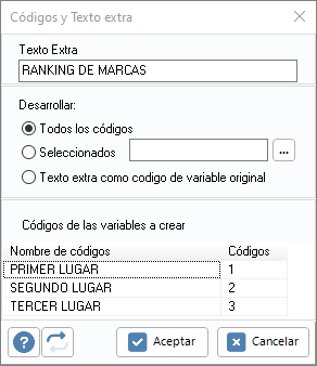 El texto extra de la variable estará formado por el texto del código que la origina, mientras que los textos de los códigos serán el original para el 1 y “Resto” para el 0 o la negación del original (según opción)