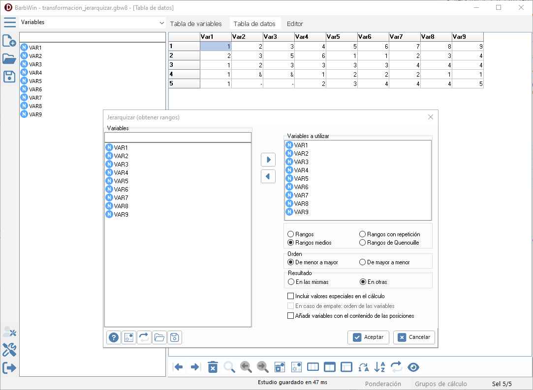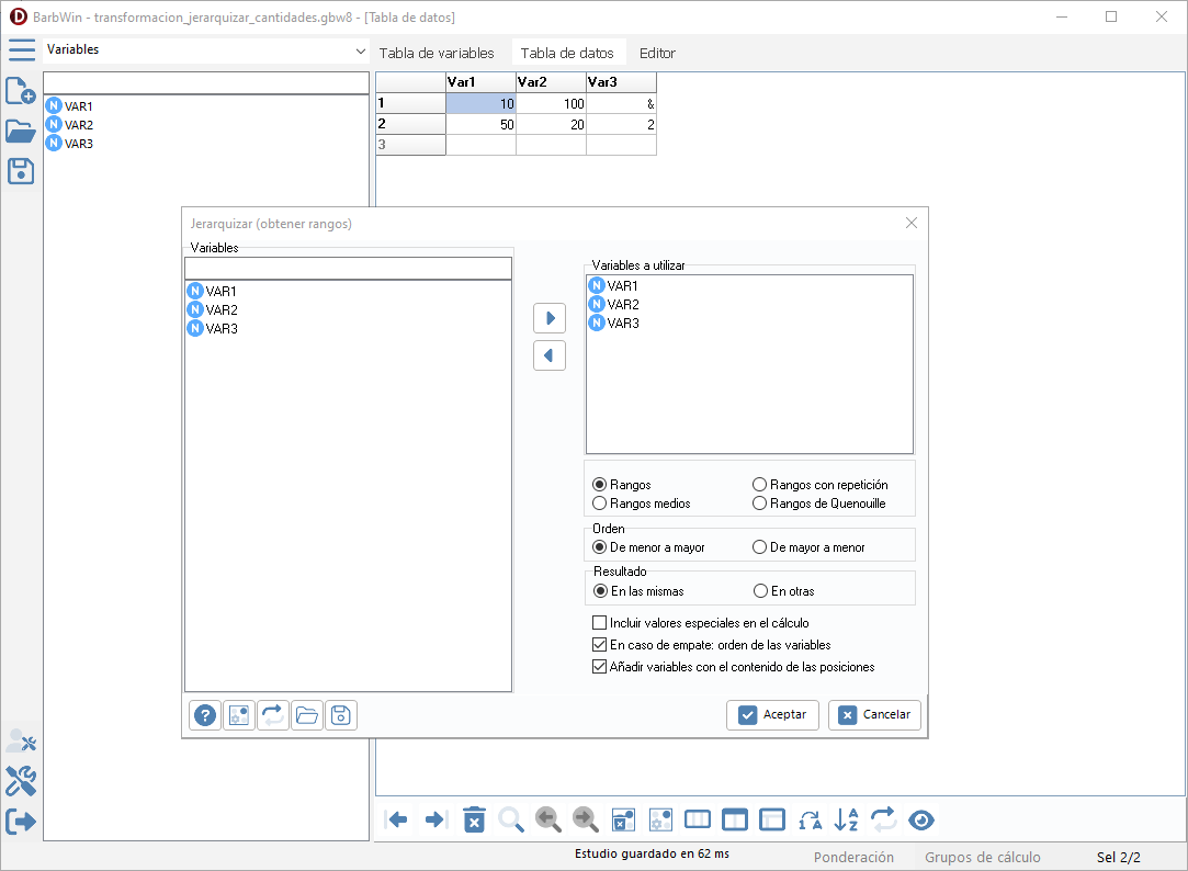 - Caso de que las variables a jerarquizar no sean rangos (orden) sino que sean cantidades, nos permite añadir las variables que contienen la cantidad ya ordenadas de mayor a menor o de menor a mayor, según elección.